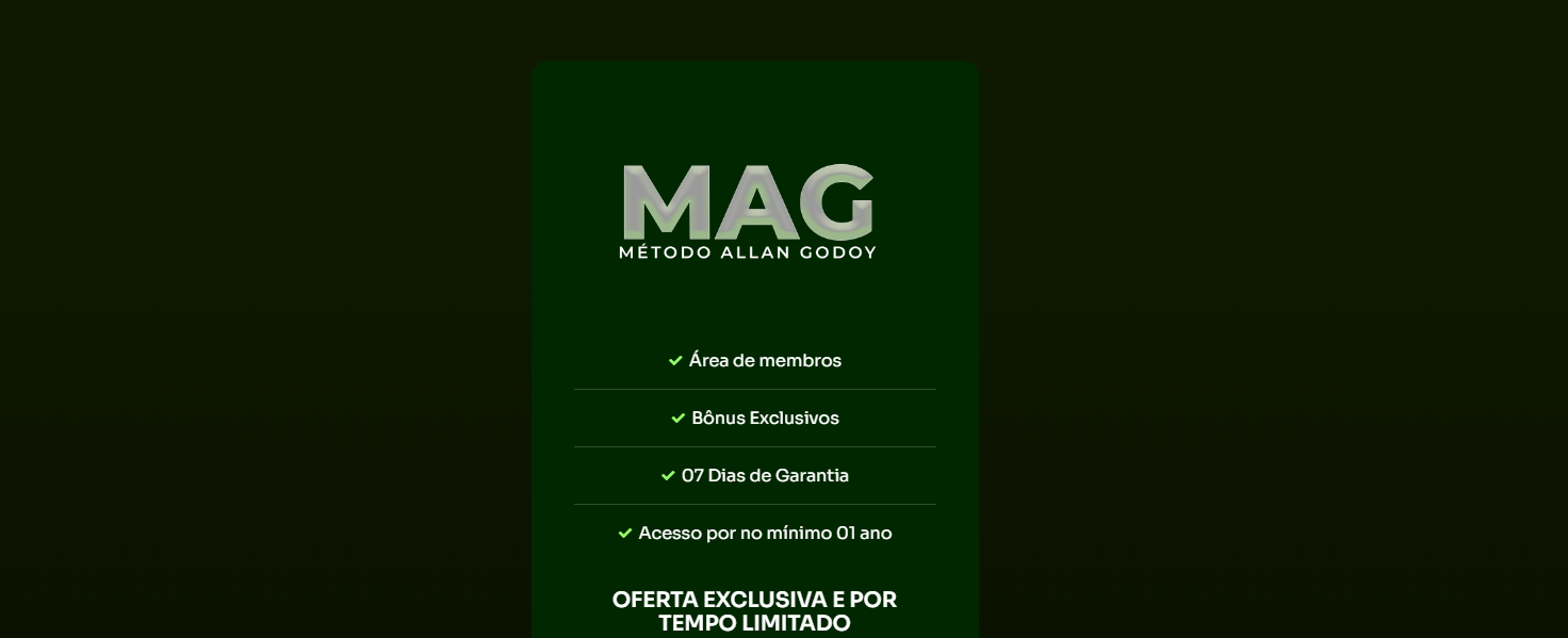 Não perca a chance de aprender na prática todas as estratégias que levaram Allan Godoy a faturar mais de R$ 30.000,00 em apenas 30 dias. Inscreva-se agora e comece a transformar sua vida financeira com o Método Allan Godoy.