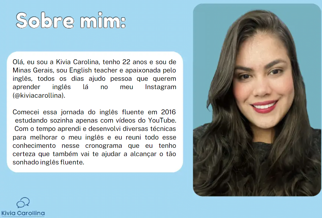 Sobre Kivia Carolina: A Mentora Apaixonada pelo Inglês e Criadora do Fluency Schedule: No mundo do aprendizado de idiomas, encontrar um guia confiável e apaixonado pode fazer toda a diferença. Kivia Carolina, uma dedicada professora de inglês, não apenas compartilha essa paixão, mas também canaliza sua experiência para oferecer aos alunos uma jornada gratificante em direção à fluência. Como a mente criativa por trás do Fluency Schedule, Kivia Carolina oferece uma abordagem única e eficaz para o aprendizado independente de inglês.
